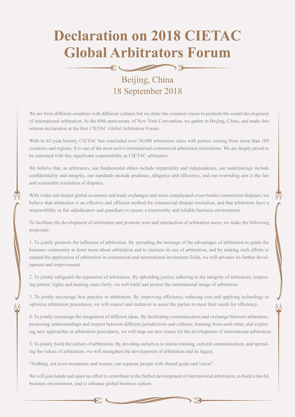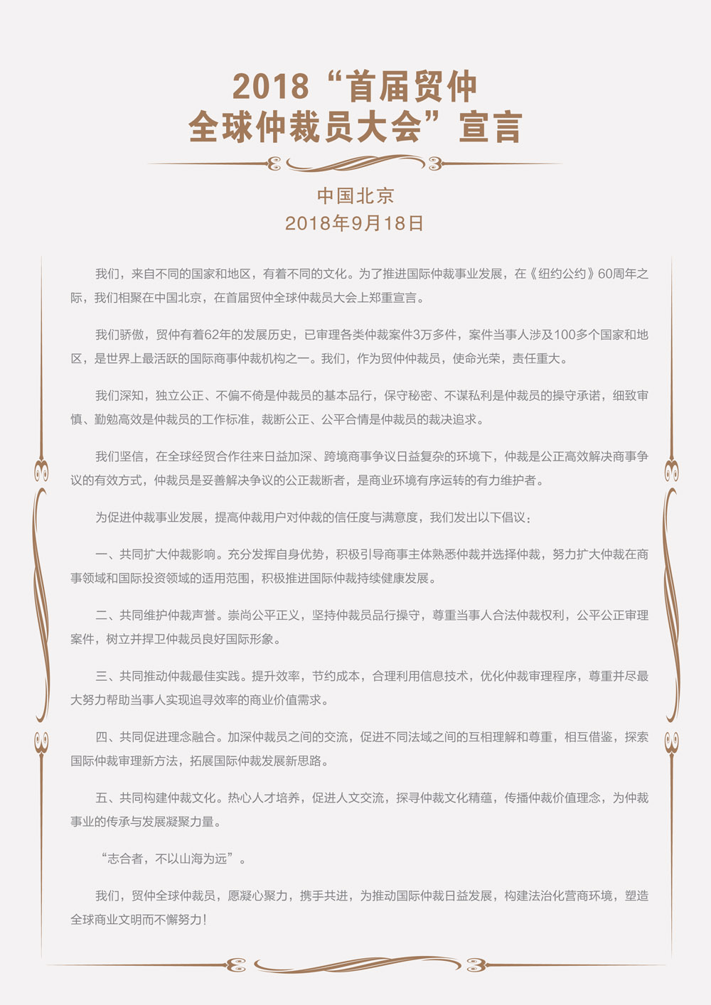中国国际经济贸易仲裁委员会(简称“贸仲”)于2018年9月18日在中国北京举行2018“首届贸仲全球仲裁员大会”,并发表宣言如下: