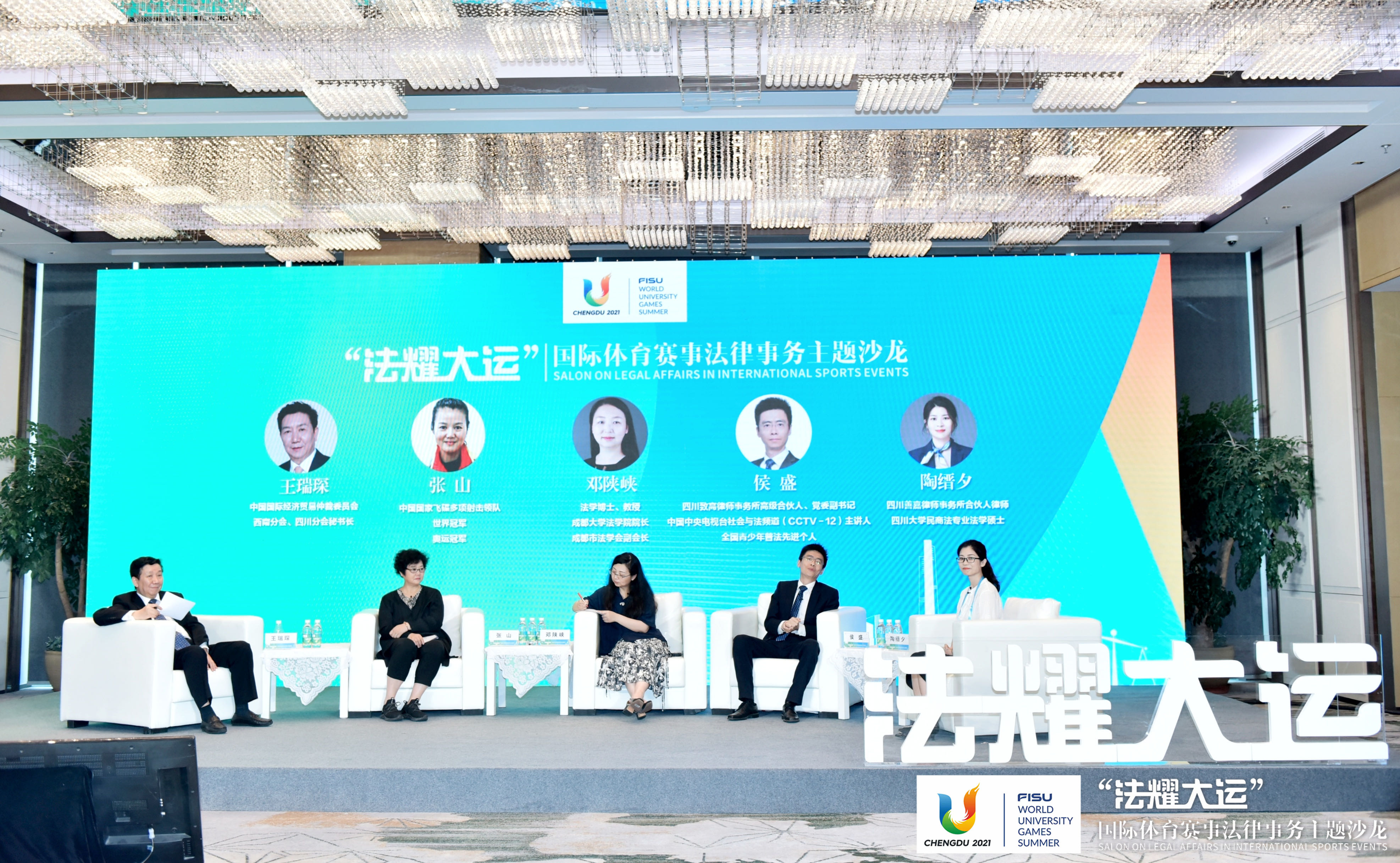 在沙龙的讨论环节中,奥运冠军张山、成都大学法学院院长邓陕峡以及侯盛律师、陶缙夕律师分别围绕“成都大运会与体育法”分享了各自的观点。