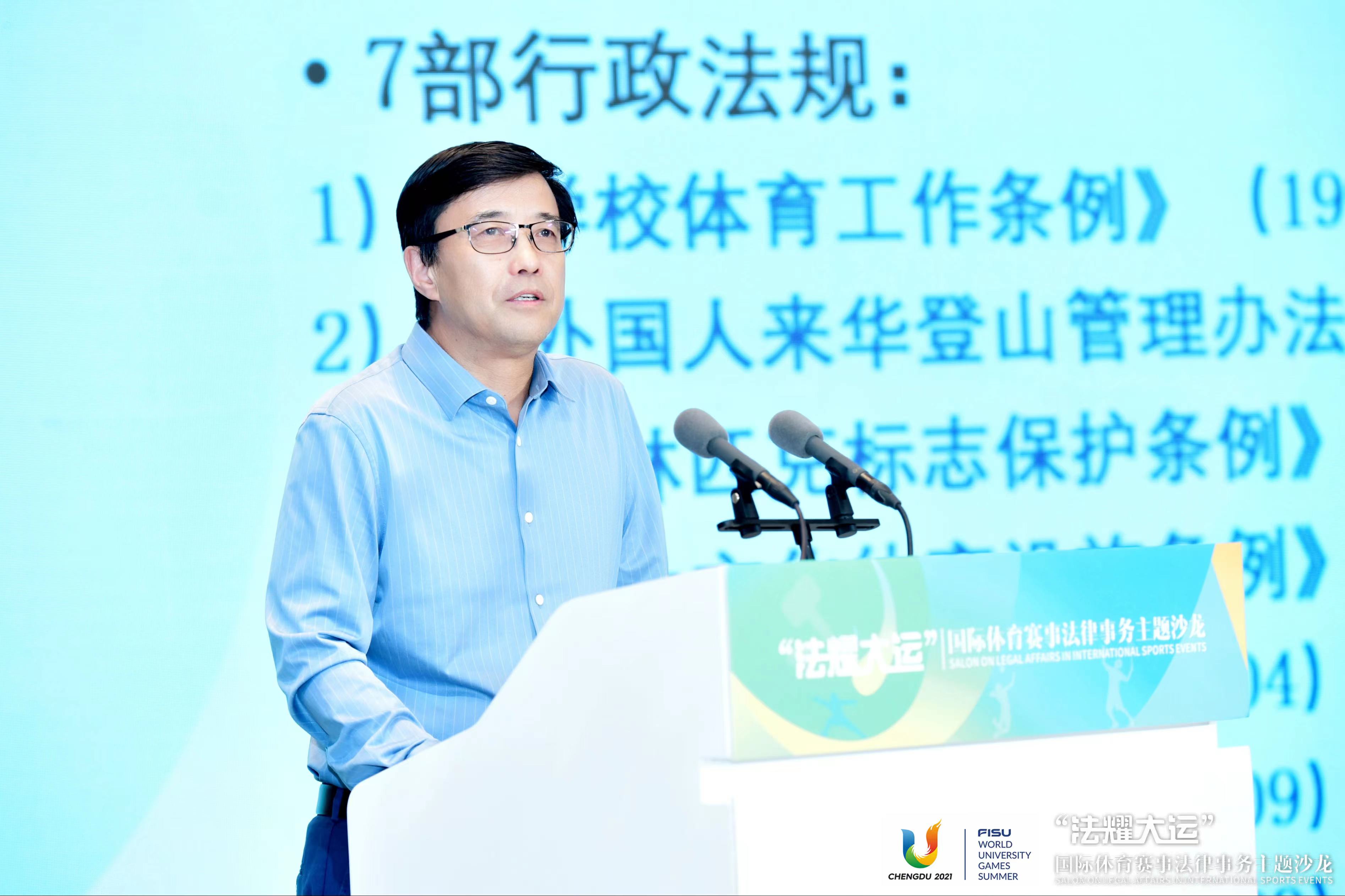 成都大运会执委会安全部党组副书记、专职副部长王万俊在主旨发言中从筹备历程、比赛项目、参赛注册等方面介绍了成都大运会的情况,强调了成都大运会的深刻意义与价值。他还结合赛事法务工作标准化、合同和文件的法律审查、延期合同专项清理、赛区和场馆法务等成都大运会的实际法务工作,从法律法规与赛事惯例的冲突平衡、赛事延期后责任分担、赛事主承协办的确定及安全风险责任分担、赛事筹备的赞助、采购等角度,分析了国际体育赛事中的法律事务难点问题。