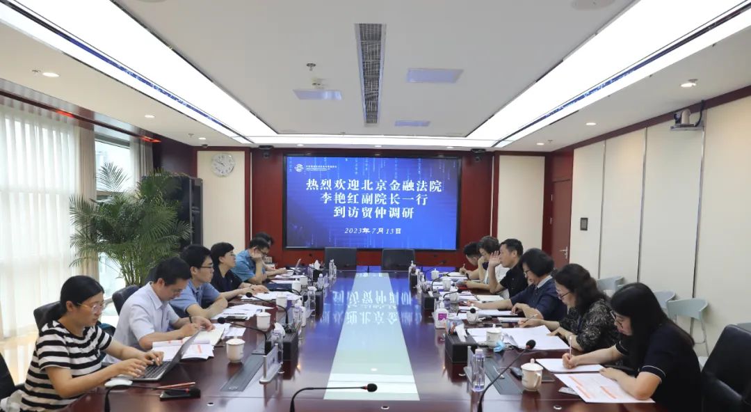 2023年7月13日上午,北京金融法院党组成员、副院长李艳红,立案庭庭长陈广辉,审一庭副庭长孙兆晖一行到访贸仲,与贸仲副主任兼秘书长王承杰、副院长解常晴等就金融仲裁案件的司法审查、优化司法与仲裁衔接机制等问题进行座谈交流。
