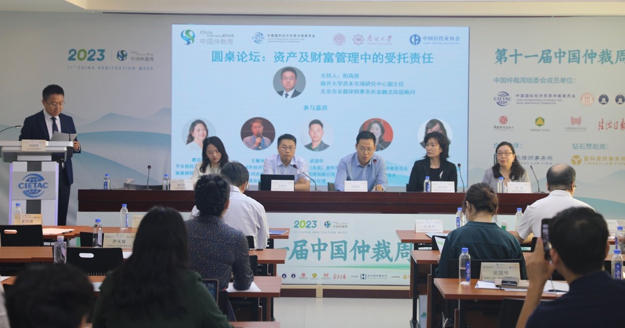 圆桌讨论环节,南开大学资本市场研究中心副主任、北京市京都律师事务所金融法高级顾问柏高原博士担任主持人。平安信托有限责任公司家族信托深圳团队投资副总监唐志妙,中国对外经济贸易信托有限公司合规法律部资深合规经理王雁冰,信银振华(北京)股权投资基金管理有限公司副总经理武国华,中国国际经济贸易仲裁委员会国际案件处副处长尹天枢,建信信托有限责任公司财富管理事业部执行总经理周萱围绕“资产及财富管理中的受托责任”这一议题,在行业观察的基础上,以信义义务的共性视角探讨行业新规与事件,并由宏观到微观,围绕投资顾问这一具体角色的信义义务问题进行分析。在此基础上,各位嘉宾以争议解决为切入点,探讨了诉讼与仲裁的选择因素,并聚焦从信托到信义的视角,对讨论进行总结。