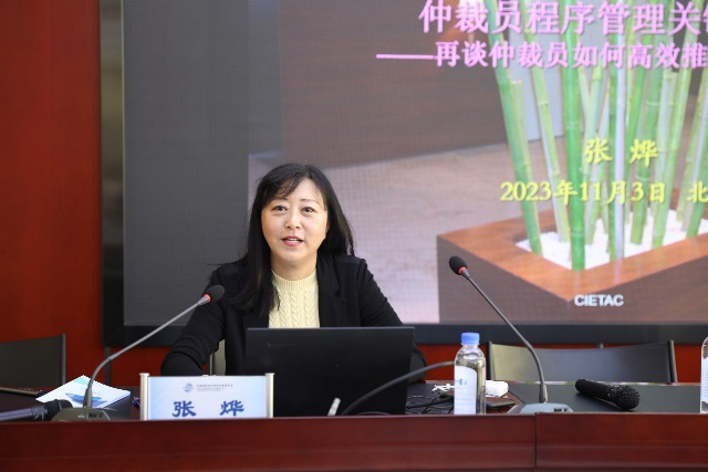 贸仲国内案件处处长张烨主要以组庭后如何尽快安排开庭为主题,就庭前阅卷、多份合同仲裁、追加当事人等重点内容进行了深入浅出的讲解,并提醒仲裁员在高效推进仲裁程序过程中应注意的事项,最后就仲裁庭和办案秘书相互理解尊重以高效推进程序提出了自己的见解。