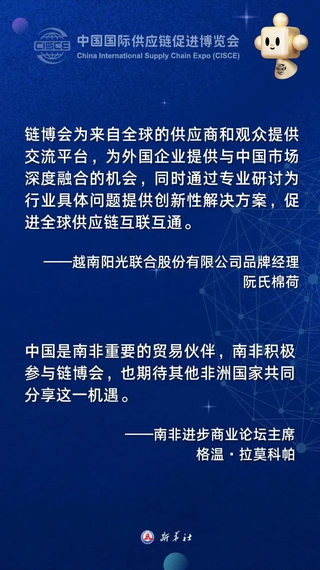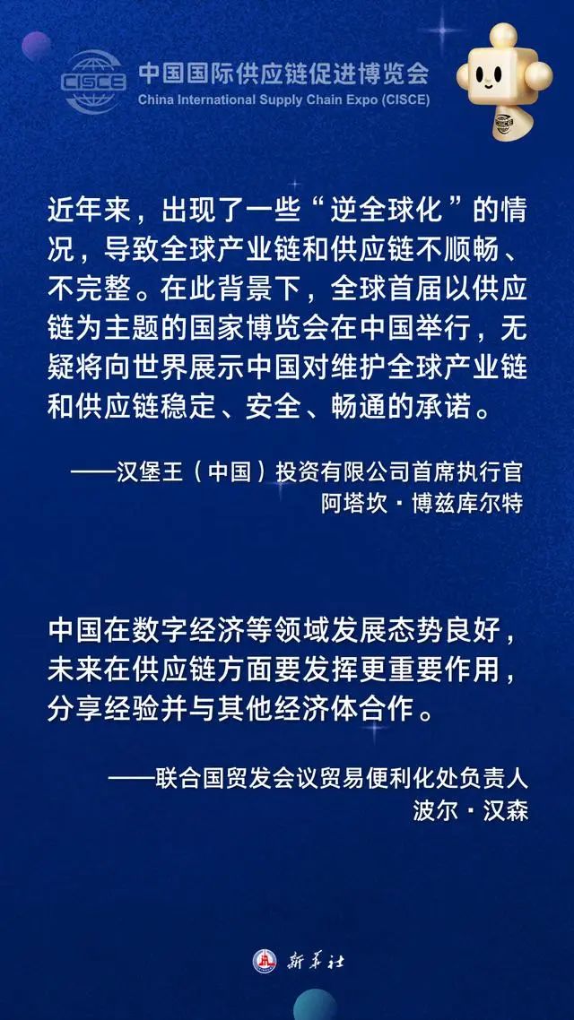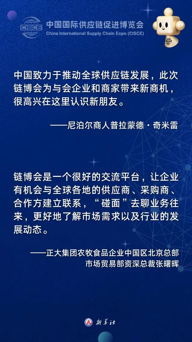 首届中国国际供应链促进博览会11月28日至12月2日在北京举行。作为全球首个以供应链为主题的国家级展会,链博会集贸易促进、投资合作、创新集聚、学习交流功能于一体。与会多国人士表示,链博会的举办展现了中国维护全球产业链供应链安全稳定的担当,期待借助这一平台拓展中外合作新机遇。