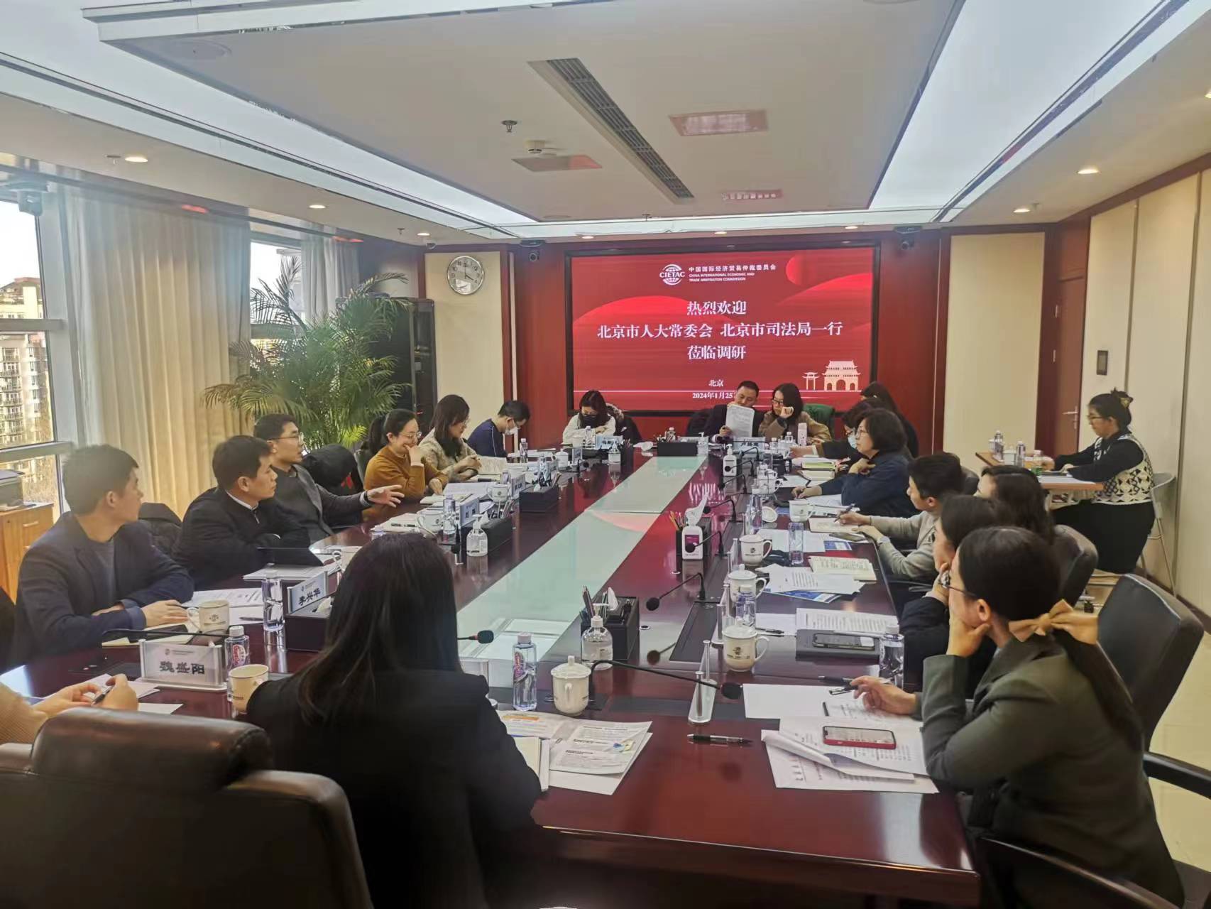 2024年1月25日下午,北京市人大常委会、北京市司法局一行到访贸仲,就北京推进国际商事仲裁中心建设及有关立法工作进行调研。中国国际经济贸易仲裁委员会(以下简称“贸仲”)仲裁院副院长解常晴接待了到访人员。