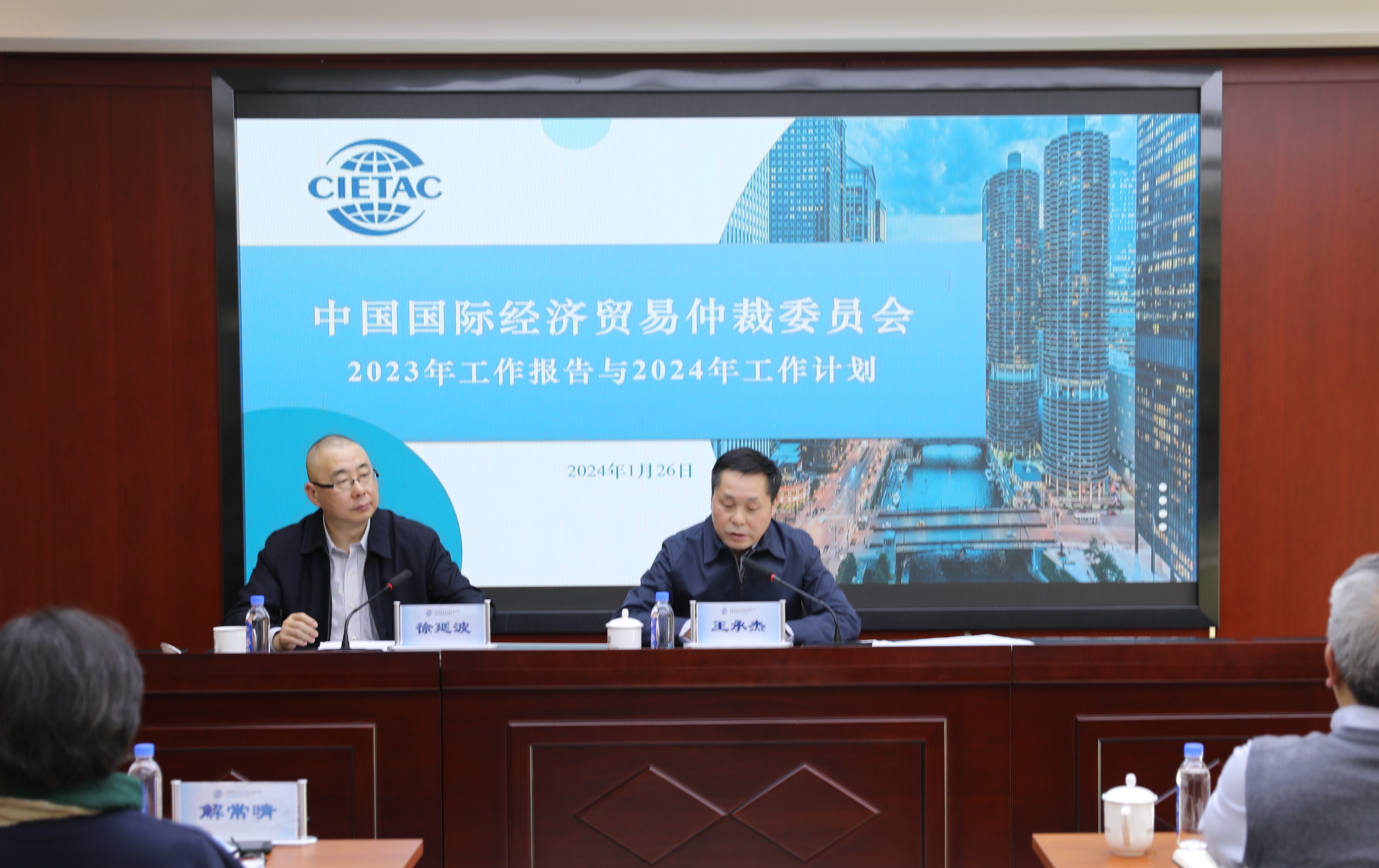2024年1月26日下午,贸仲委2023年度干部职工总结大会在北京国际商会大厦召开,贸仲委全体领导班子成员、总分会干部职工出席会议。会议全面回顾2023年工作成果,深刻分析当前形势,谋划部署2024年工作任务。贸仲委副主任兼秘书长王承杰作2023年工作总结,贸仲委党委书记徐延波主持会议。