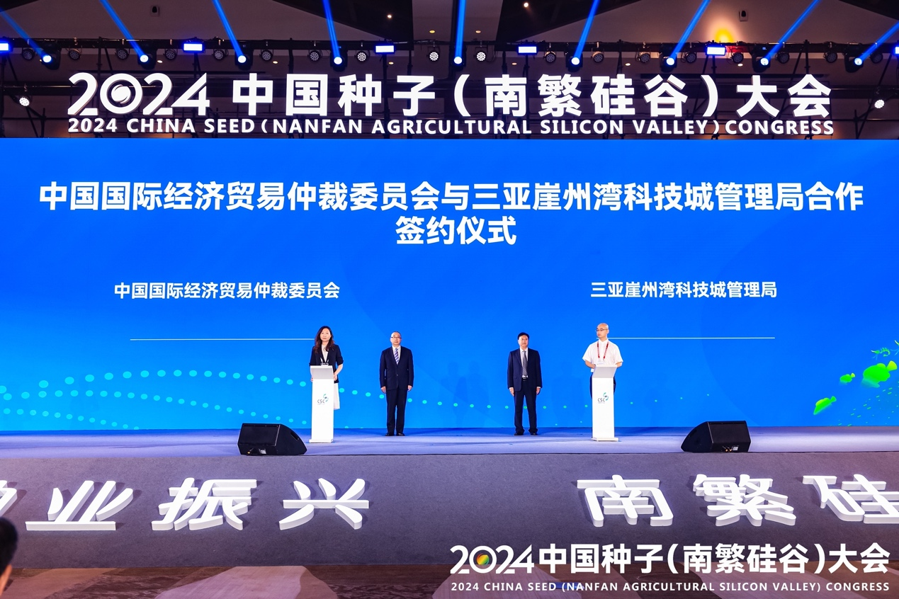 2024年3月17日,在2024中国种子(南繁硅谷)大会上,中国国际经济贸易仲裁委员会(简称“贸仲委”)与三亚崖州湾科技城管理局正式签署合作协议。贸仲党委书记徐延波、三亚市人民政府副市长张长丰作为见签人参加签约仪式,中国国际经济贸易仲裁委员会海南仲裁中心(简称“贸仲委海南中心”)副秘书长吕岩、三亚崖州湾科技城管理局党委委员、副局长吕继洲在《合作协议书》上签字。
