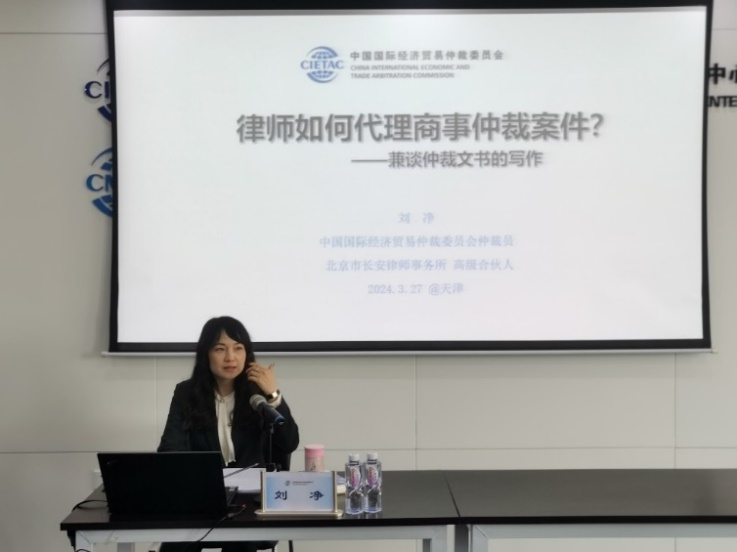 2024年3月27日下午,由中国国际经济贸易仲裁委员会(以下简称“贸仲”)天津分会与天津市律师协会仲裁专业委员会联合主办的“青年律师仲裁业务研修班”第二次专题活动在津成功举办。本次活动主题为“律师如何代理商事仲裁案件?——兼谈仲裁文书的写作”,贸仲仲裁员、北京市长安律师事务所高级合伙人刘净女士主讲,贸仲仲裁员靳朝晖先生主持活动,贸仲天津分会秘书长周雯女士作总结发言。研修班40余名学员参加了本次活动。