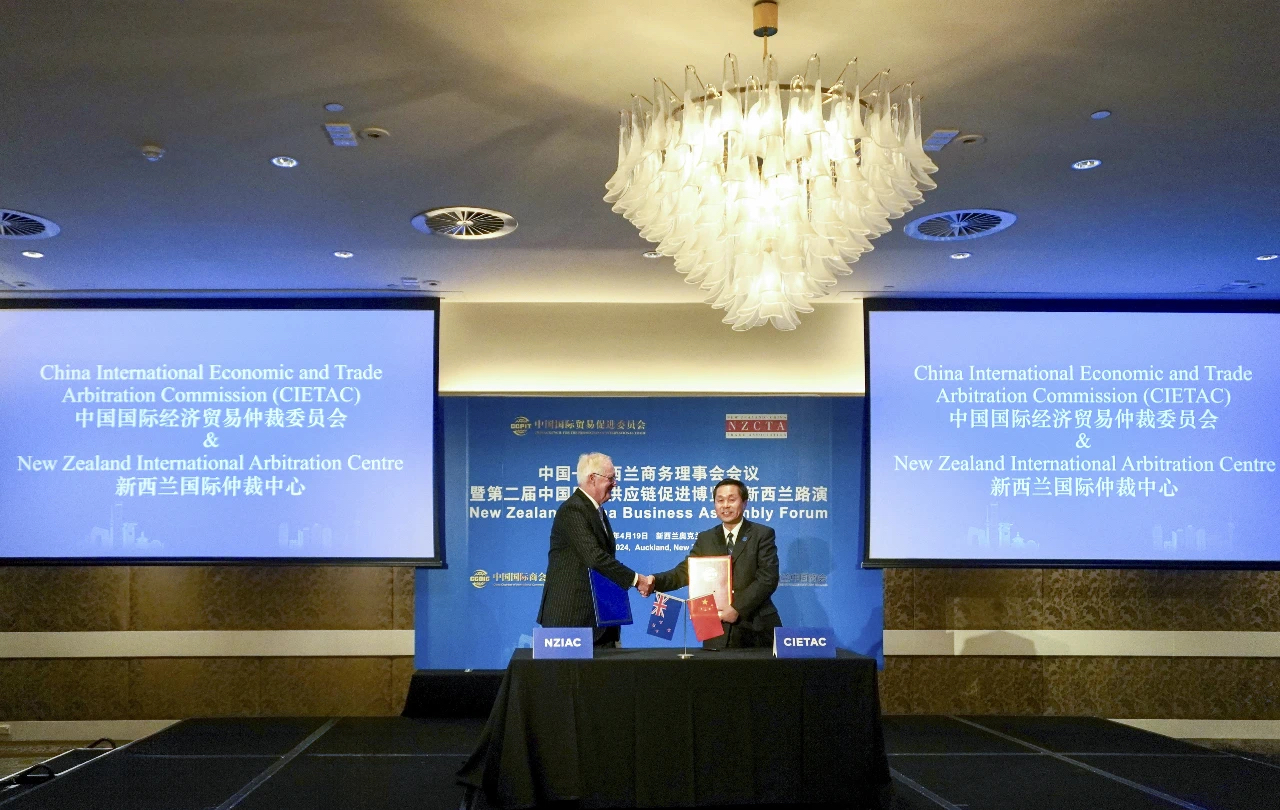 4月19日,在中国贸促会会长任鸿斌率中国企业家代表团访问新西兰期间,中国国际经济贸易仲裁委员会副主任兼秘书长王承杰与新西兰国际仲裁中心主任约翰·格林在奥克兰于第五届中国—新西兰商务理事会会议上签署合作协议。中国贸促会会长任鸿斌、新西兰中国贸易协会主席约翰·考克伦、中国驻新西兰大使王小龙等出席签约仪式。