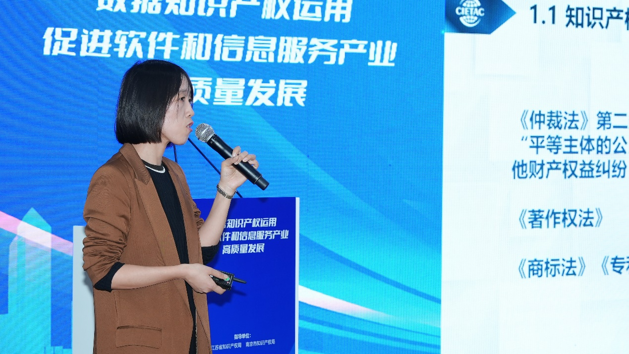 随后,在主题演讲环节,贸仲江苏中心秘书长助理孙静女士以“知识产权仲裁促进高质量发展”为题发表演讲,她从知识产权仲裁的相关立法出发,介绍了知识产权仲裁的范围,并就知识产权仲裁的优势和企业进行知识产权仲裁的策略进行了详尽介绍。江苏省知识产权保护中心运用促进部部长丁甜女士以“数据知识产权登记与运用”为题介绍了数据知识产权申请人进行登记的实务操作流程和注意要点。