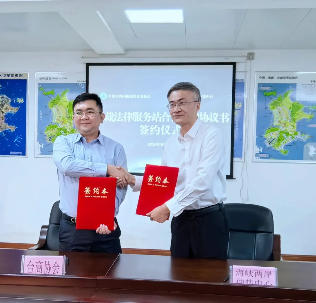 为贯彻落实《关于支持福建探索海峡两岸融合发展新路 建设两岸融合发展示范区的意见》,更好发挥海峡两岸仲裁中心涉台法律服务功能,2024年6月5日上午,海峡两岸仲裁中心(简称“仲裁中心”)与平潭台商协会举行《仲裁法律服务站合作框架协议书》签约及服务站揭牌仪式。