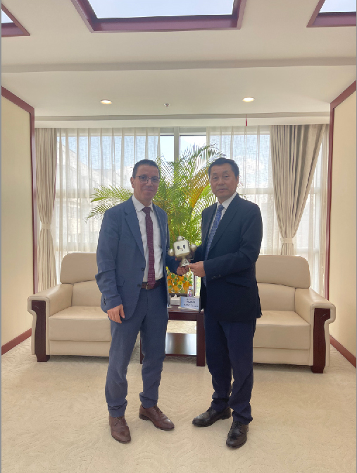 (王承杰秘书长向Smail HALFAOUI先生赠送链博会吉祥物“链氪”)