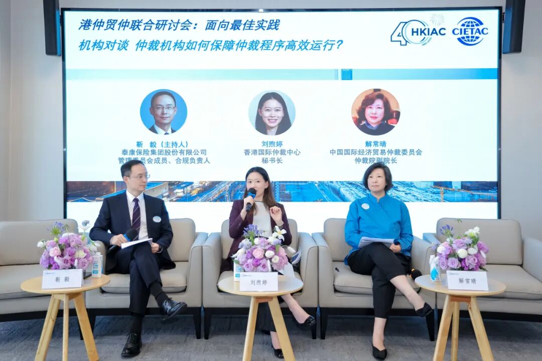 本次研讨会共设三个环节:机构对谈、小组讨论与小组辩论。机构对谈环节以“仲裁机构如何保障仲裁程序高效进行”为主题,由泰康保险集团股份有限公司管理委员会成员、合规负责人靳毅主持。贸仲仲裁院副院长解常晴与港仲秘书长刘煦婷针对仲裁程序中的关键节点,围绕文件送达、核阅制度、多合同仲裁等方面,分享了在案件管理、程序优化和效率提升方面的经验与实践,并展开深入交流。