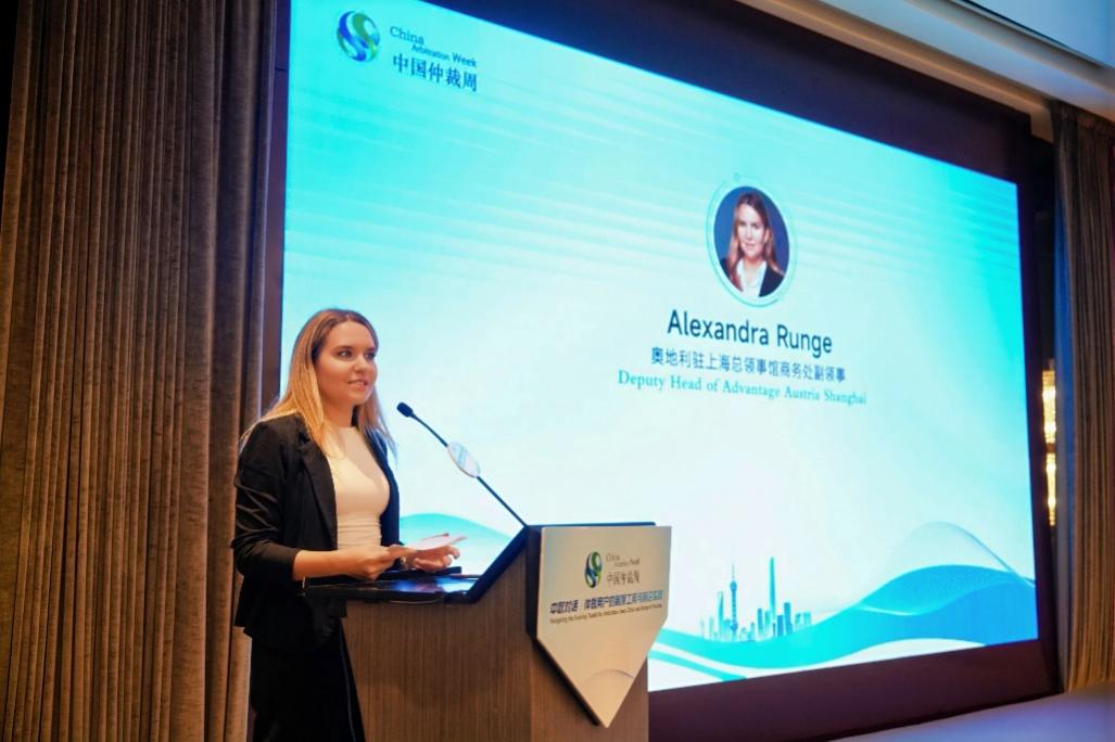 Alexandra Runge 副领事在致辞中表示,奥地利与中国经贸合作历史悠久,2024 年双边贸易额超 200 亿欧元,中国的长三角地区是奥地利的投资热点地区。她指出,国际仲裁对促进奥地利和中国的跨国贸易和投资起到了关键的作用,而维也纳是国际仲裁的优选地——VIAC和贸仲在欧洲的唯一海外分中心——贸仲欧洲仲裁中心均坐落于此。她希望本次论坛能够加深中国和欧洲对彼此的仲裁发展趋势的了解,并且加强中国与奥地利乃至欧洲的商业往来。