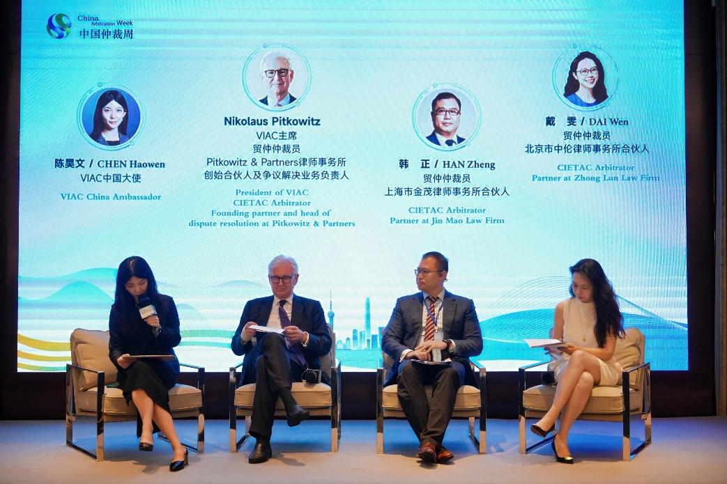 在由VIAC中国大使陈昊文主持的第一个圆桌讨论环节, Nikolaus Pikowitz主席、贸仲仲裁员、上海市金茂律师事务所合伙人韩正先生和贸仲仲裁员、北京市中伦律师事务所合伙人戴雯女士围绕“中欧法律和实践中的仲裁支持措施”,结合贸仲和VIAC规则和实践,探讨了紧急仲裁员程序,临时措施的申请门槛、证据要求及策略性运用,中国和欧洲法院在支持仲裁程序中可提供的协助手段,并与现场观众进行了互动。