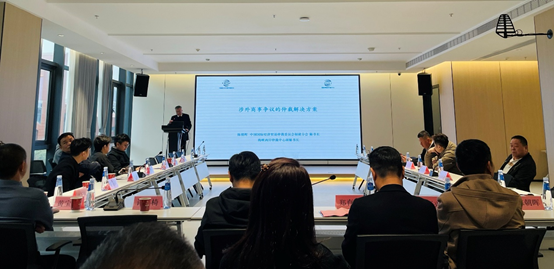 会上,陈朝晖秘书长围绕“涉外商事争议的仲裁解决方案”进行专题分享。他系统介绍了贸仲及海峡中心的工作与职能,并结合多个典型实务案例,深入阐释了仲裁在高效、专业解决涉外商事纠纷方面的核心优势与价值。他还围绕企业“走出去”的实际需求,为企业订立仲裁条款、防控法律风险提供了专业指引,获得了与会各方的积极反馈。