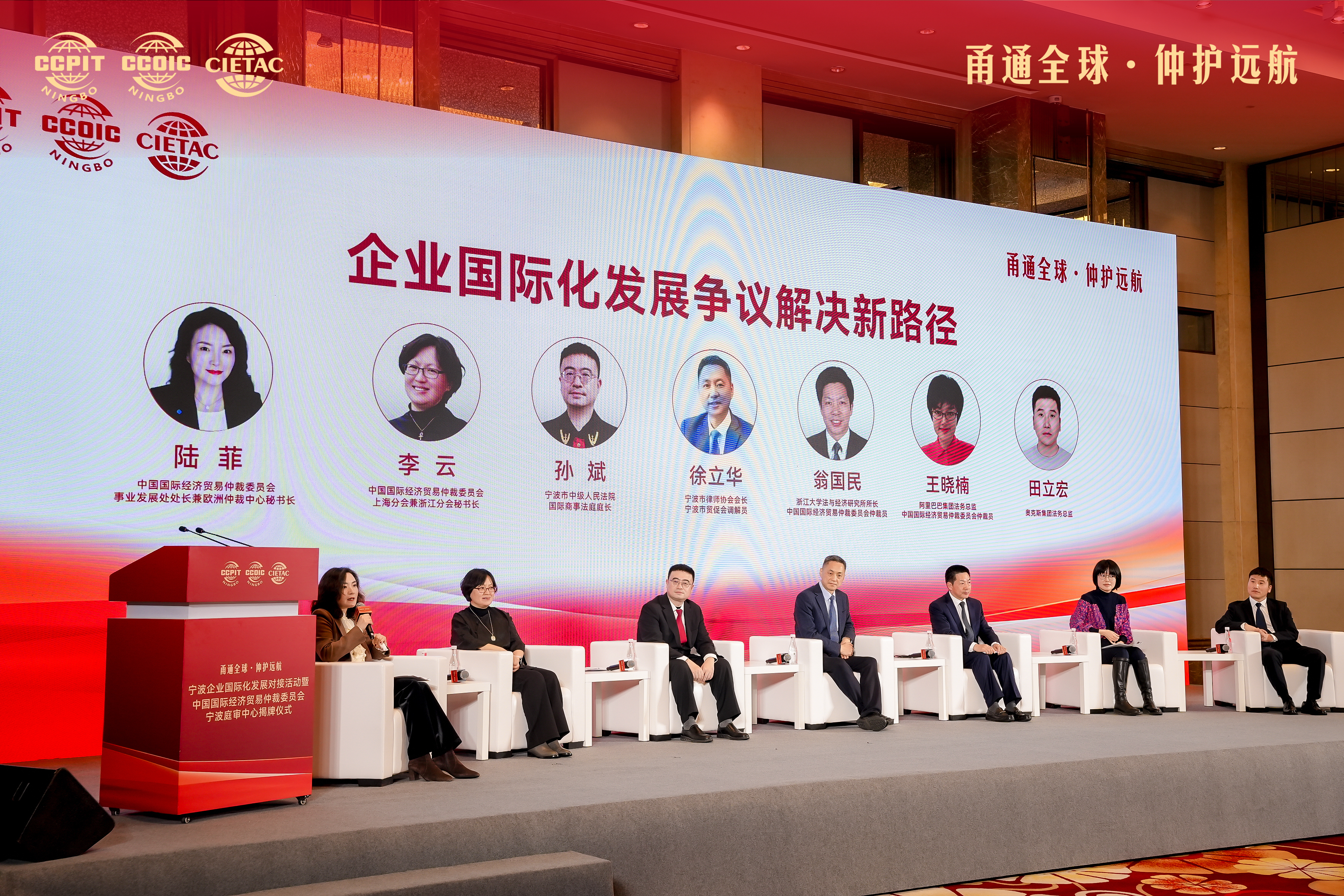 (从左至右:贸仲事业发展处处长、欧洲仲裁中心秘书长陆菲,贸仲上海分会、浙江分会秘书长李云,宁波市中级人民法院国际商事法庭庭长孙斌,宁波市律师协会会长、贸仲仲裁员徐立华,浙江大学法与经济研究所所长、贸仲仲裁员翁国民,阿里巴巴集团法务总监、贸仲仲裁员王晓楠,奥克斯集团法务总监田立宏)