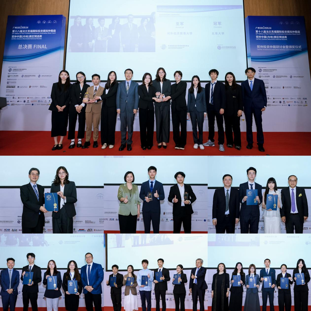 (从上到下、从左到右:贸仲仲裁院副院长谷岩先生为冠亚军代表颁奖,香港特别行政区律政司国际法律专员、亚太经合组织经济委员会主席丁国荣博士为决赛阶段最佳辩手颁奖,环中律师事务所合伙人邢媛女士为季军代表颁奖,贸仲仲裁员、环球律师事务所合伙人张昕先生及贸仲仲裁员、礼德齐伯礼律师行合伙人李连君先生共同为半决赛阶段最佳辩手颁奖,富而德律师事务所合伙人柳昕先生及贸仲仲裁员、上海市金茂律师事务所合伙人韩正先生共同为获得一等奖的参赛队伍代表颁奖,中山大学法学院院长张亮教授为获得二等奖的参赛队伍代表颁奖,贸仲华南分会副秘书长金曦女士为获得三等奖的参赛队伍代表颁奖)