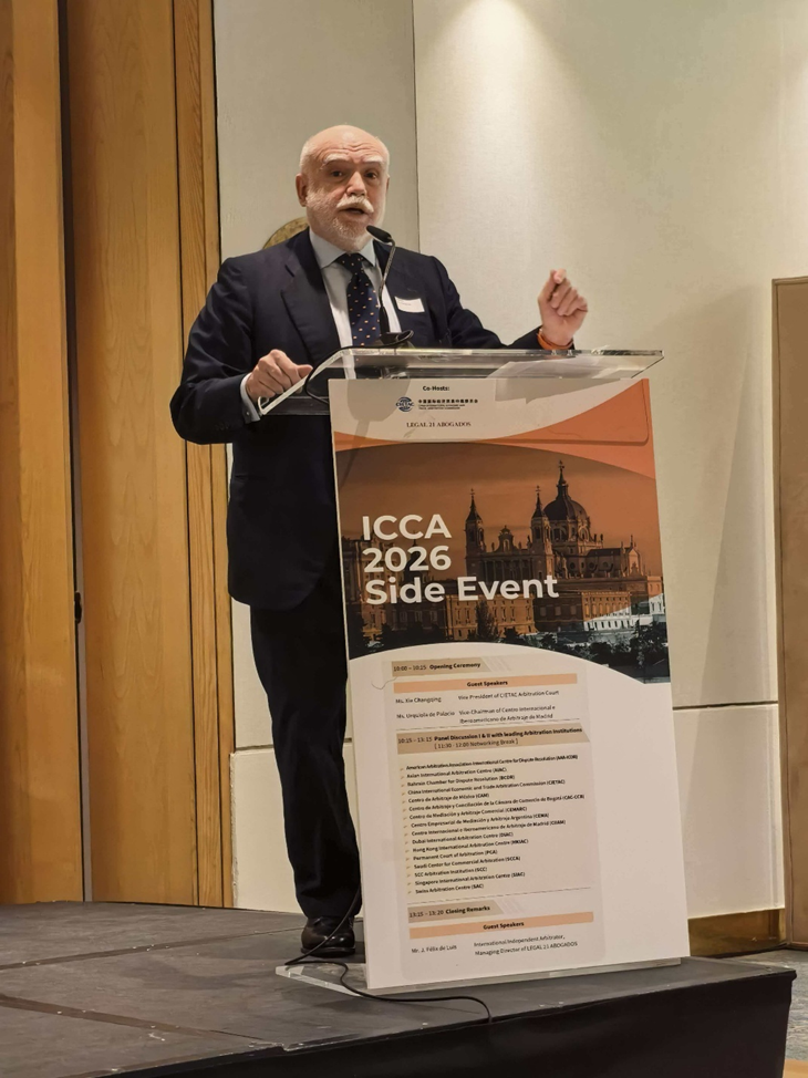 Urquiola de Palacio副主席在致辞中表示,马德里作为国际仲裁的重要舞台,非常荣幸能够迎来来自全球16家仲裁机构的代表。她高度评价贸仲在推动东西方仲裁交流方面所作出的努力,并期待中西仲裁界以及伊比利亚美洲与亚洲仲裁机构之间能够以此次会议为契机,进一步加强对话与合作,共同探索国际仲裁融合发展的新路径。