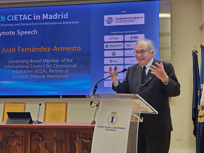 马德里国际仲裁中心-伊比利亚美洲仲裁中心主席José María Alonso Puig在致辞中高度评价贸仲在国际仲裁领域的卓越贡献,并对贸仲代表团的到访表示热烈欢迎。他指出,马德里凭借其优越的地理位置、完善的法律体系以及与拉丁美洲共同的语言文化纽带,正日益成为连接欧洲与拉丁美洲仲裁市场的核心枢纽。随着西班牙与中国经贸合作日益紧密,仲裁应当在两国企业“走出去”过程中发挥更大作用,热烈欢迎更多中资企业和法律界人士利用马德里的仲裁资源,他期待中西仲裁界在未来开展更加紧密的合作,共同服务两国企业的跨境发展需求。